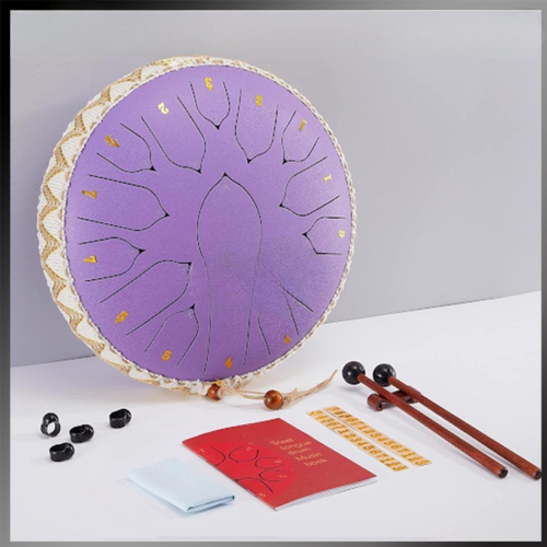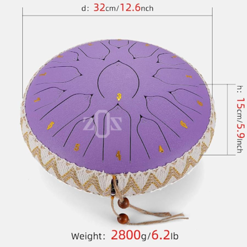 -The 13 inch steel drum with 15 notes. The sound of different rhythms is produced by the circular vibration of the air and the drum body. The sound reverberates through the air and is longer lasting and more ethereal than the echoes of other instruments, leaving you with a feeling of relaxation and pleasure from within.